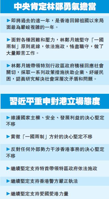 習主席昨於中南海接見林鄭月娥,他形容今年是「香港回歸祖國以來局面最為嚴峻複雜的一年」,面對各種困難和壓力,林鄭月娥能夠堅守「一國兩制」原則底線、依法施政、恪盡職守,帶領特區政府積極回應社會關切,採取一系列政策措施輔助企業、紓解民困,並希望她帶領特區政府認真研究解決社會深層次矛盾和問題。