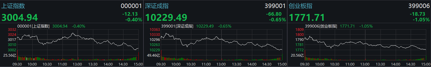 【香港商報網訊】三大股指全天高開低走,震蕩下行,滬指險守3000點。截至發稿,滬指跌0.4%,報3004點,深成指跌0.65%,報10229點,創業板指跌1.05%,報1771點。