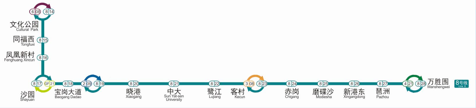 据悉,八号线新增同福西和文化公园站,其中文化公园站与六号线换乘,全线换乘站增加到5座(万胜围与四号线换乘、客村与三号线换乘、昌岗与二号线换乘、沙园与广佛线换乘)。同福西站位于洪德路与同福路交界处,同福路有较为完好的骑楼街,骑楼文化浓厚,周边商住云集,是广州市“河南”地区的老城区之一;而文化公园站则毗邻上下九商业步行街、沙面公园、文化公园、十三行、华林寺等名胜景点。两站的开通,将为周边市民提供更方便快捷的出行方式。