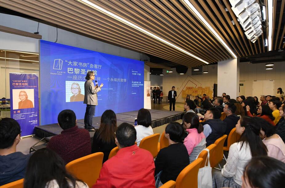當天下午,URBANUS都市實踐建築設計師事務所創建合伙人、主持建築師、坪山文化聚落總設計協調人、坪山圖書館專家諮詢委員會委員王輝,以《巴黎聖母院:一座歷史的豐碑,一個永續的激情》為「大家書房」會客廳的主題,在法國原版音樂劇《巴黎聖母院》即將登場坪山大劇院之前,向市民普及了關於巴黎聖母院的基礎知識。作為國內罕見的擁有哥特式建築測繪研究背景的建築師,王輝從宗教、文學、建築斷代史等多層面解讀巴黎聖母院。