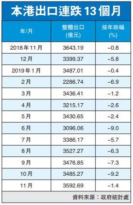 11月出口貨值為3593億元,按年下跌1.4%;進口貨值為3854億元,按年下跌5.8%;錄得有形貿易逆差為262億元,相等於商品進口貨值的6.8%。