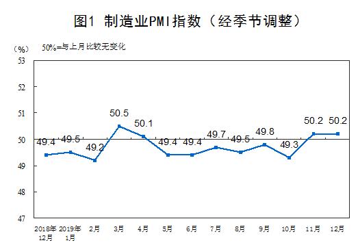 2019年12月份,中国制造业采购经理指数(PMI)为50.2%,与上月持平。
