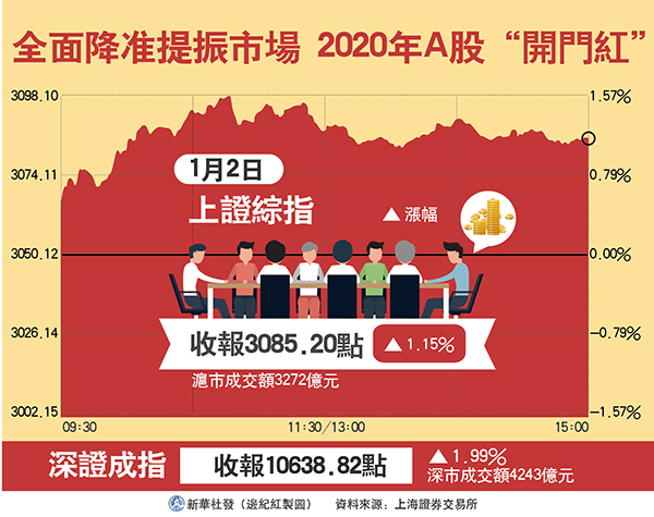 1月1日,人行宣布將在1月6日實施0.5個百分點的全面降準,強力推動內地股市的綜合表現。2日早盤,內地股市受全面降準利好刺激高開高走,上證綜指最高推進到3098點,挑戰3100點整數關口意味濃厚。