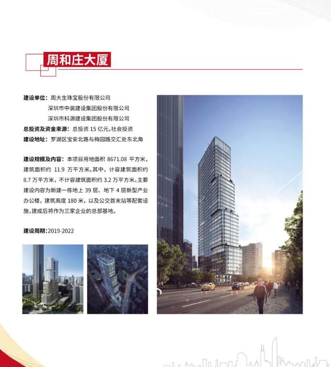 其中,作為本次活動舉行地的周和庄大廈,位於筍崗片區寶安北路與梅園路交匯處東北側,屬於產業發展類項目,總投資15億元,用地面積8671平方米,建築面積約11.9萬平方米,將新建一棟地上39層、地下4層新型產業辦公樓,以及公交首末站等配套設施,建成後將作為珠寶及裝飾裝修的文化創意產業總部研發基地,對推動企業創新發展、促進科技成果轉化和產業化有着重要作用。