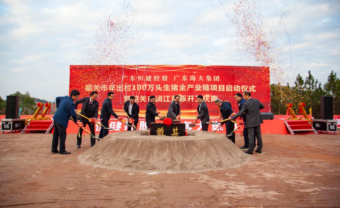 為促進粵東西北地區經濟發展,促進農民增產增收,保障粵港澳大灣區人民「菜籃子」工程。1月3日,由廣東恆健投資控股有限公司(以下簡稱恆健控股)、廣東海大集團股份有限公司(以下簡稱海大集團)共同發起的韶關市年出欄100萬頭生豬全產業鏈項目啟動暨湞江益豚奠基儀式在韶關市湞江區隆重舉行。項目總投資30億元,建成後將包含生態智慧養殖、飼料加工、生豬屠宰、冷鏈運輸等養殖全產業鏈。廣東省農業農村廳等相關領導出席活動。恆健控股董事長溫文星、海大集團董事長薛華出席現場並參加奠基儀式。