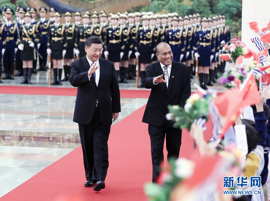 1月6日,国家主席习近平在北京人民大会堂同基里巴斯总统马茂会谈。这是会谈前,习近平在人民大会堂北大厅为马茂举行欢迎仪式。 新华社记者 丁林 摄