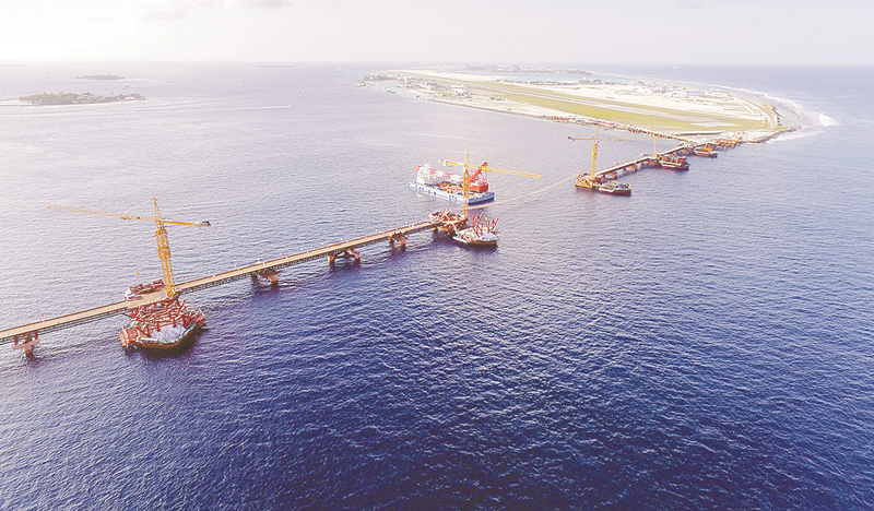 圖為中馬共建 「一帶一路」的重要合作項目——馬爾代夫中馬友誼大橋建設現場。新華社