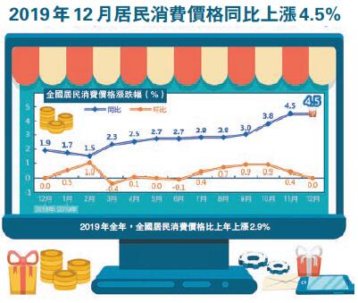 【香港商报网讯】中國CPI月度同比漲幅連續兩個月處「4時代」。國家統計局昨日發布數據顯示,2019年12月,CPI同比上漲4.5%,漲幅與上月持平。去年以來,受豬肉價格大幅上漲的影響,中國月度CPI屢創新高。綜合全年來看,CPI增幅為2.9%,較2018年加快0.8個百分點,雖創2012年以來新高,但仍控制在年初的預期目標範圍3%內。