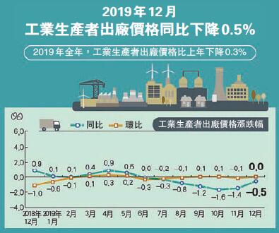 PPI方面,數據顯示,從環比看,12月PPI由上月下降0.1%轉為持平;從同比看,12月PPI下降0.5%,降幅比上月收窄0.9個百分點;2019年全年,PPI比上年下降0.3%。