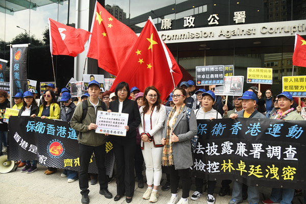 民間團體「保衛香港運動」近百名成員,手持「違法披露廉署調查,快檢控林卓廷洩密」等橫幅紙牌,遊行至廉署總部大樓。他們沿途高呼「曝受查人身份,已犯防賄條例」「廉署一視同仁,快檢控林卓廷」等口號。
