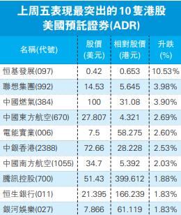 總結全周,美股三大指數全面上升,道指累升近0.7%;標指累升逾0.9%;納指亦升1.8%。至於港股ADR上周五升跌不一,並預示恒指今日高開58點,報28697點。