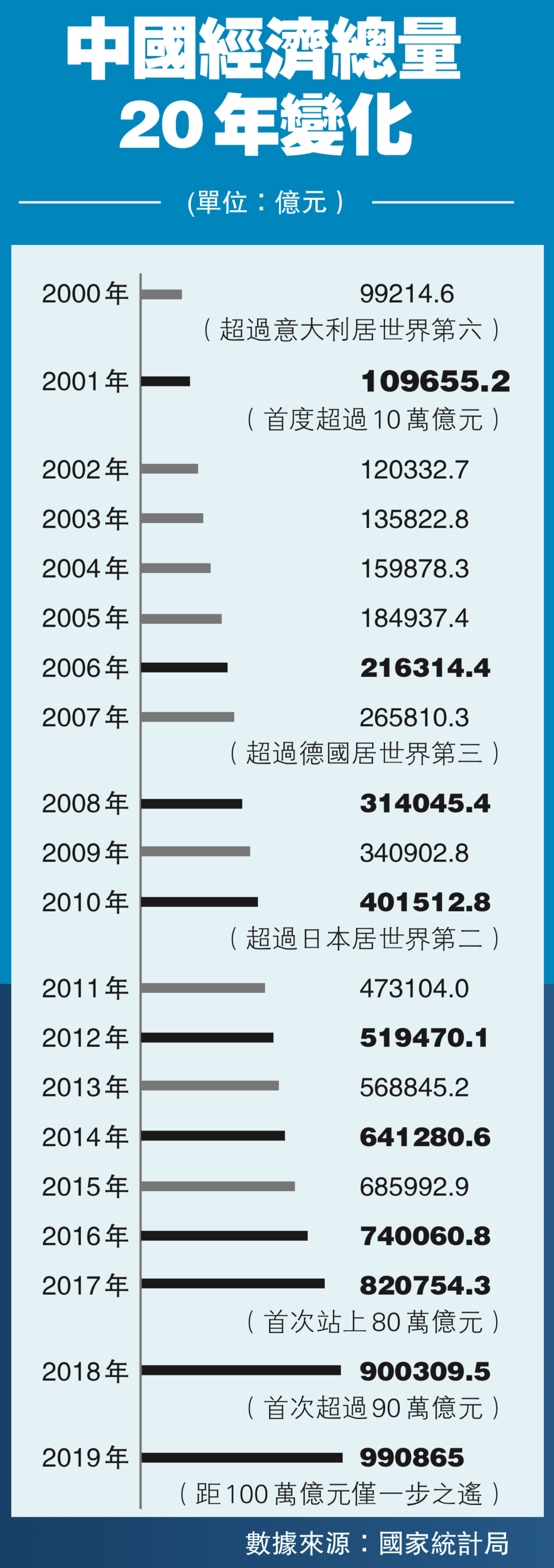根據初步核算,2019年國內生產總值990865億元,按可比價格計算,比上年增長6.1%。此前三年,中國經濟總量已連續跨越70萬億、80萬億和90萬億元大關。