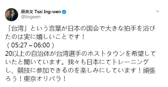 蔡英文在推特上这样写道:“‘台湾’一词在日本国会得到掌声,真是太开心了!(05:27~06:00)听说日本有20个以上的自治体希望接待台湾选手。我们也将加强训练,期待参加比赛!加油!东京盛会!”