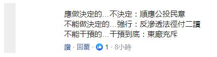 不过,蔡英文的回应也饱受质疑,有台网友指责蔡英文“应做决定的不决定,如顺应(核电)‘公投’民意;不能做决定的强行做决定,如强行通过‘反渗透法’;不能干预的干预到底,如放任‘东厂’。”