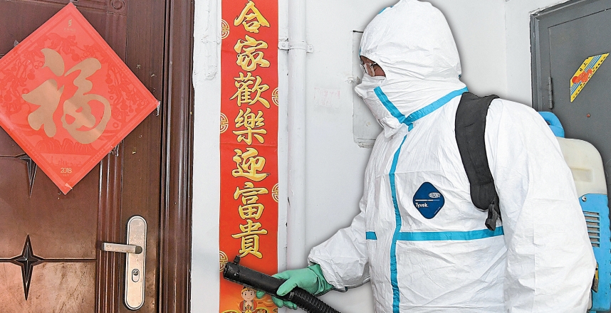 昨日,工作人員對北京西王莊小區的樓道進行消毒。新華社