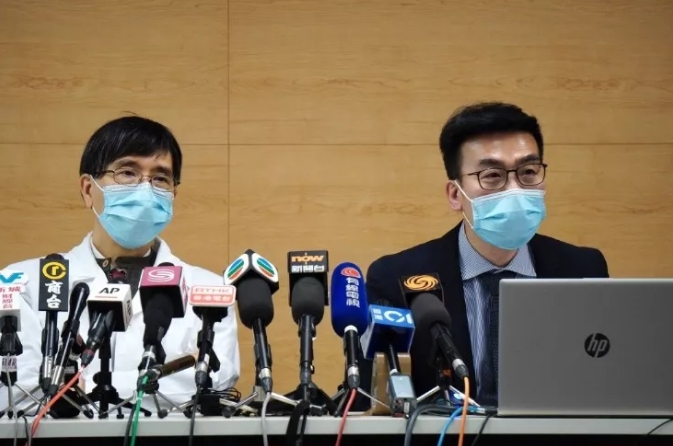 袁國勇(左)昨與醫管局總感染控制主任賴偉文(右)講述最新疫情。 記者 馮俊文攝