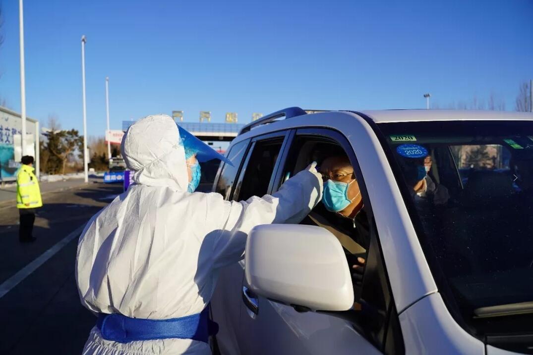 在齊齊哈爾高速路口,王文濤搖下車窗主動接受體溫測量,回答檢測人員的問詢。