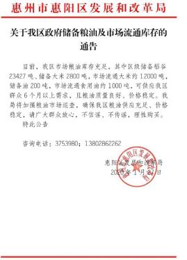 为应对疫情,惠阳区发改局严格按照粮食安全政府责任制各项工作要求,筑牢粮食安全底线,自打响疫情防控战起,严格要求各粮食企业、各镇(街)粮所工作人员落实每天24小时值守制,启动并实施粮食波动情况日报制度。及时发布《惠阳区政府储备粮油及市场流通库存的通告》,避免群众恐慌性抢购。