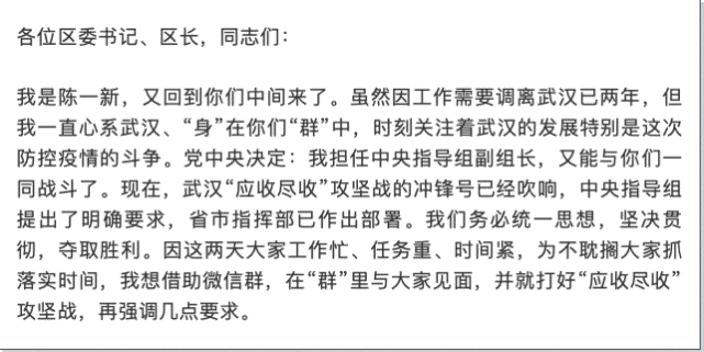 2月8日,湖北武汉,全国疫情的中心点。在武汉各区区委书记、区长组成的微信工作群里,“大家好,我是陈一新。党中央决定:我担任中央指导组副组长,又能与你们一同战斗了!”