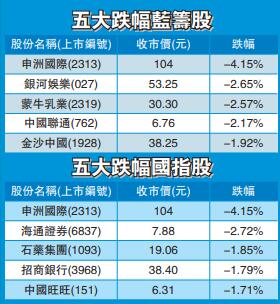 其他股份方面,阿里健康(241)上周宣布向阿里巴巴(9988)購天貓平台售藥業務,股價昨飆13.08%,收報13.66元。另外,康哲藥業(867)強烈否認沽空機構第二份報告的指控,股價收升1.37%,報10.34元。