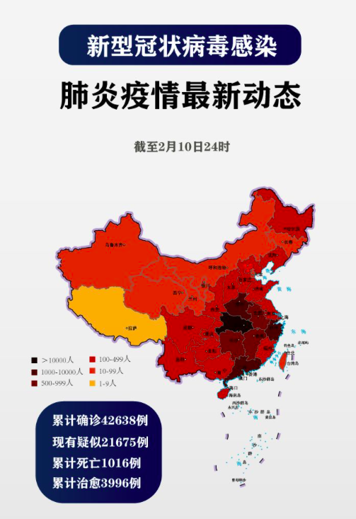 截至2月10日24时,据31个省(自治区、直辖市)和新疆生产建设兵团报告,现有确诊病例37626例(其中重症病例7333例),累计治愈出院病例3996例(浙江核减1例),累计死亡病例1016例,累计报告确诊病例42638例(浙江核减12例,江西核增1例),现有疑似病例21675例。累计追踪到密切接触者428438人,尚在医学观察的密切接触者187728人。