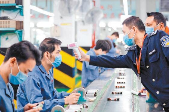 廣東一企業每隔2小時為生產線上的員工測一次體溫。 新華社