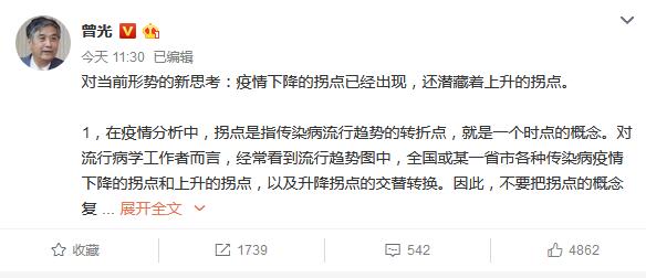 12日上午11时30分许,中国疾控中心流行病学首席科学家曾光在个人微博发文,称疫情下降的拐点已经出现,但还潜藏着上升的拐点。