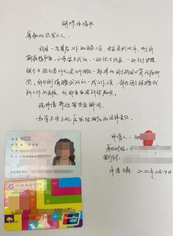 2月14日上午,惠阳区人民法院(下称“惠阳法院”)执行局收到被执行人张某提交的一份解冻申请书以及一份承诺书,积极争取申请人同意后,立即通过网络与银行对接,对被执行人张某名下账户被冻结的特定款项予以解除,以实际行动支持抗疫。