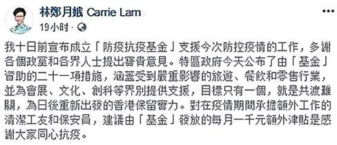 前天夜間,特區政府公布防疫抗疫基金措施的當晚,林鄭月娥於社交網站帖文,透露自政府宣布成立防疫抗疫基金後,各個政黨和各界人士均提出寶貴意見。她說,特區政府公布的21項措施,涵蓋受到嚴重影響的旅遊、餐飲和零售行業,並為會展、文化、創科等界別提供支援,目標只有一個,就是共渡難關,為日後重新出發的香港保留實力。