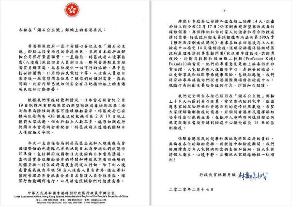 林鄭在信函中稱,雖然日本政府已安排他們隔離14日,但由於船上不斷出現確診個案,因此要求他們返港後馬上入住檢疫中心,接受14天強制檢疫。林鄭強調,完全明白他們已因被困郵輪十多天而感到身心疲累,希望盡快回到家中,但因應專家風險評估及香港疫情仍嚴峻,希望他們理解強制檢疫需要。