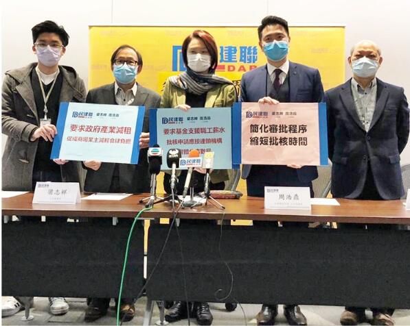 民建聯主席李慧琼、立法會議員梁志祥及周浩鼎,昨日聯同香港餐務管理協會會長楊位醒及該黨的扶貧委員會委員葉文斌舉行記者會。李慧琼指出,政府早前宣布用防疫抗疫基金支援餐飲業界,大型食肆可獲最多20萬元津貼。該黨要求當局簡化審批程序,大幅縮短批核時間,務求達致「及時雨」作用。