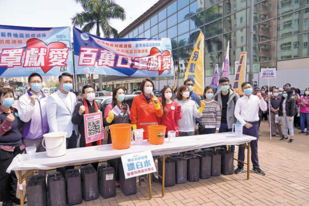 民建聯昨早在全港18區,100多個街站向市民派發由全港抗疫連線送贈的口罩,其中主席李慧琼及議員葛珮帆更在大圍港鐵站外派送漂白水,不少市民手持口罩開心大合照,及自備膠樽、玻璃樽等取走漂白水。