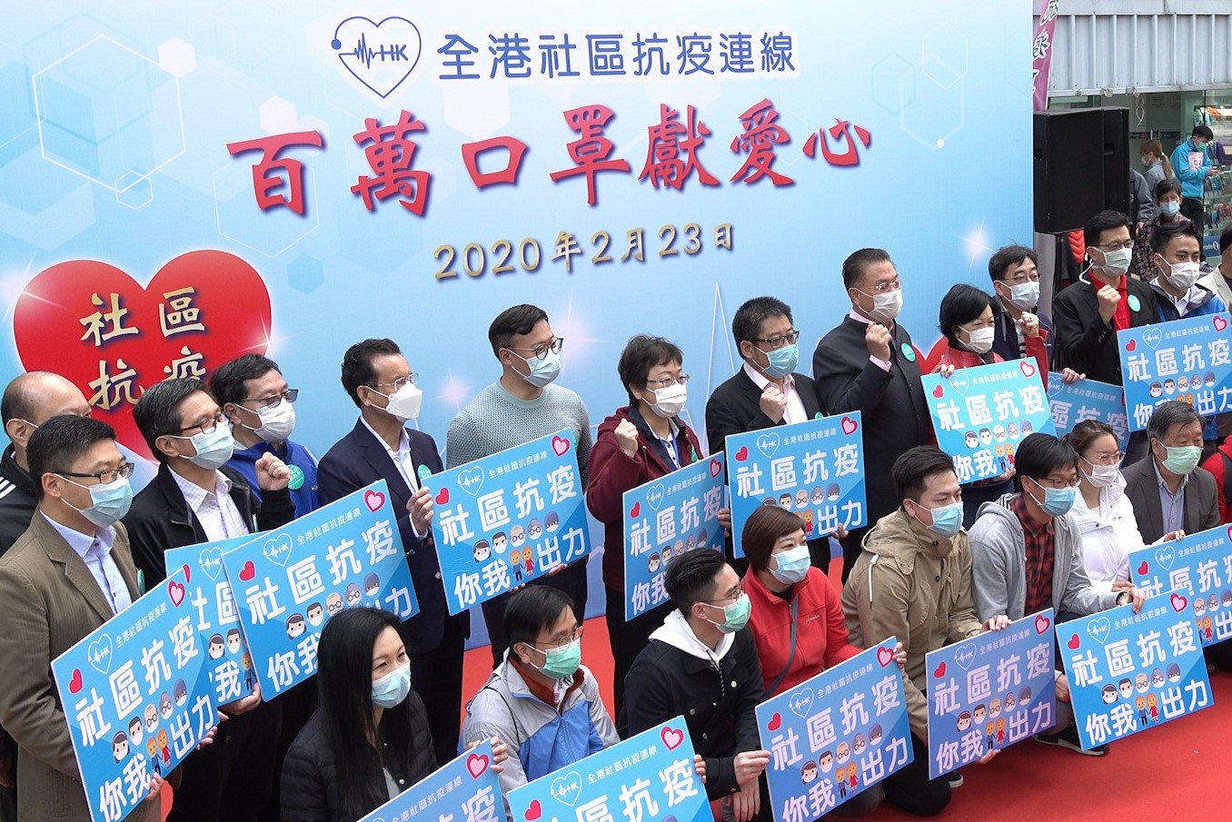 「全港社區抗疫連線」在小西灣街市舉行「百萬口罩獻愛心」大行動啟動儀式。圖:橙新聞