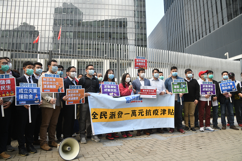 昨早,民建聯約20名成員到政府總部外請願。民建聯指,受到7個月暴動事件及新冠肺炎疫情的雙重打擊,香港正面對前所未有、甚至是遠超2003年沙士襲港時期的經濟危機,企業倒閉及失業潮隨時爆發。他們認為,政府今年財政預算案毋須計較短暫的財赤,而要善用儲備,大力推出為納稅人和中小企紓困抗疫和寬免稅務的措施,以助他們應對失業及經濟逆境。