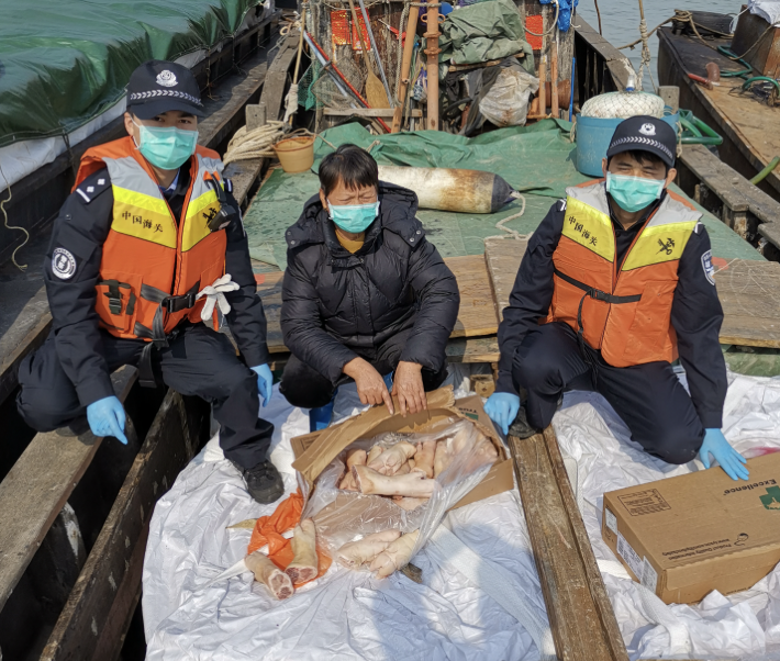 在查獲走私凍品的同時,海關人員在現場還發現有2名船員體溫異常,存在發燒情況。該關立即啟動相關預案,現場關警員做好個人防護,對發熱人員開展流行病學調查、醫學排查、隔離觀察、衛生處理等後續處置,採集咽拭子送實驗室,經實驗室檢測顯示2名船員新冠病毒核酸檢測陰性。