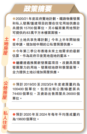 財政預算案料2020年至2024年的5年間,每年平均私樓落成量約1.96萬伙,較過去5年的平均增加約25%。土地供應方面,2020/2021年賣地計劃共有15幅住宅用地,料可興建約7500個單位,加上鐵路物業發展及私人發展和重建項目,預計全年潛在土地供應可興建約1.57萬個單位。賣地計劃亦包括六幅商業用地,預計可提供約83萬平方米樓面面積。