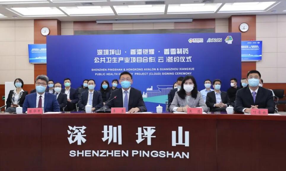 國家衛健委高級別專家組成員、中國工程院院士、SARS病原病毒發現者袁國勇,深圳市坪山區委書記陶永欣,香港鎧耀生物醫藥科技(管理)有限公司董事會主席、香港醫學專業學院院士、澳門科技大學健康科學學院院長霍文遜,香港鎧耀創始人、香港大學和香港理工大學名譽教授、香港中文大學生物醫學科學院顧問委員劉耀南,香雪製藥董事長王永輝,香港希瑪國際眼科醫療集團創始人林順潮,香港大學醫學院微生物學系教授陳鴻霖,香港理工大學創新及科技發展總監劉樂庭等出席簽約儀式並先後發言。坪山區人民政府區長李勇主持簽約儀式。