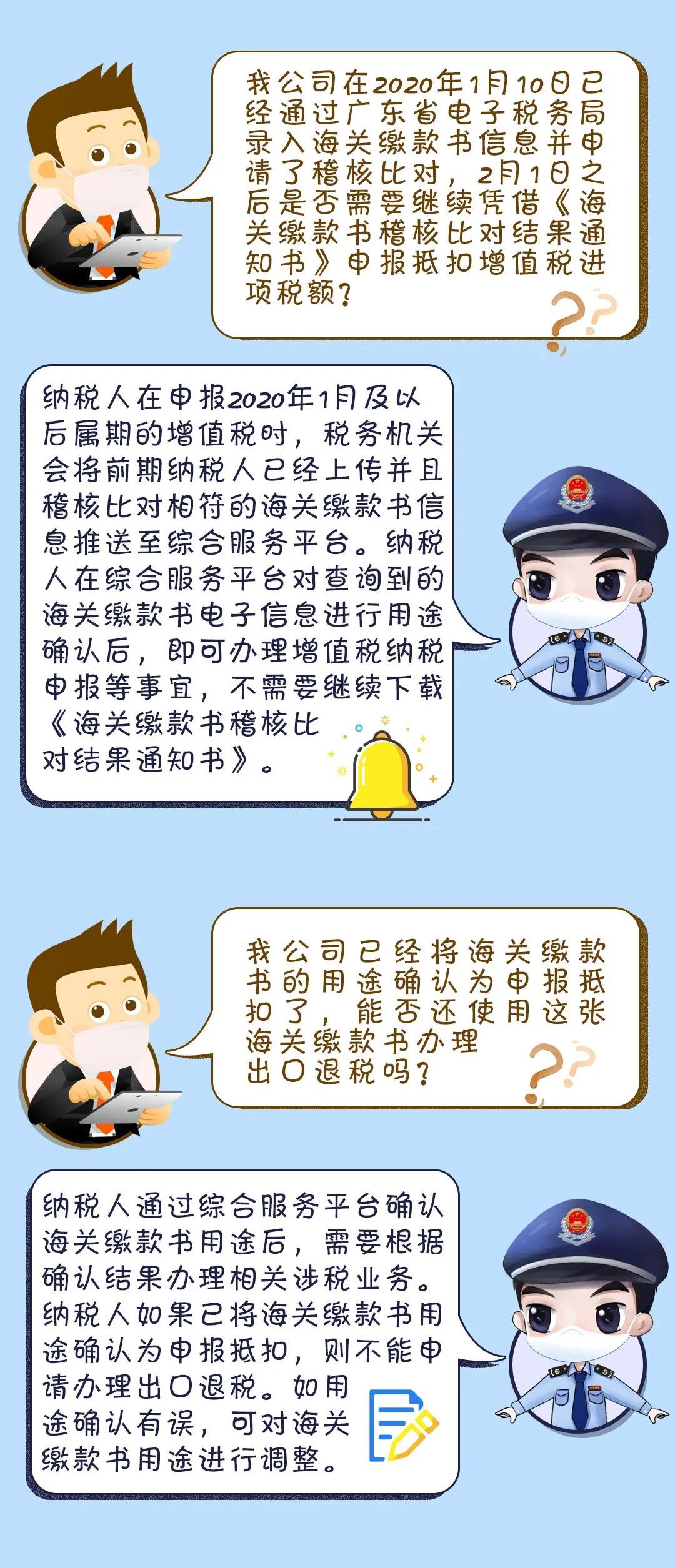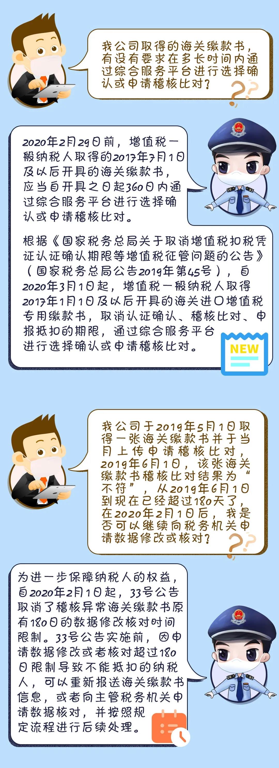 税务总局发布了《国家税务总局关于增值税发票管理等有关事项的公告》(国家税务总局公告2019年第33号),规定从2020年2月1日起,增值税一般纳税人取得海关进口增值税专用缴款书(以下简称“海关缴款书”)后如需申报抵扣或出口退税,应通过增值税发票综合服务平台(以下简称“综合服务平台”)进行查询、选择、确认。