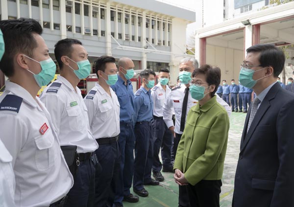 林鄭月娥與前線救護員和消防員交談。 政府新聞處