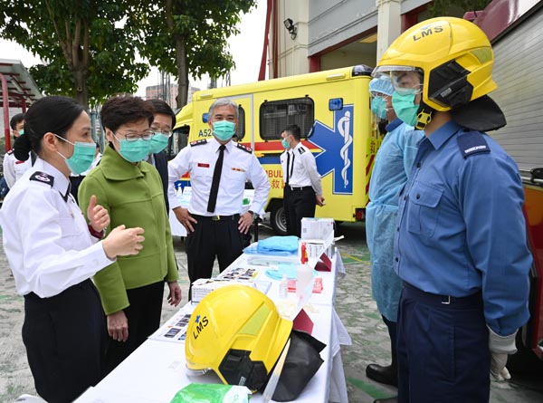 林鄭昨日還探訪葵涌梨木樹消防局暨救護站,感謝消防和救護人員一直走在抗疫最前線,日以繼夜為市民提供緊急服務。