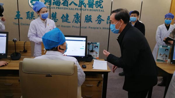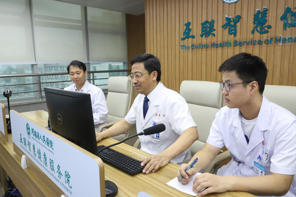 河南省人民醫院黨委書記顧建欽(中)在互聯智慧健康服務院線上平台接診首位患者