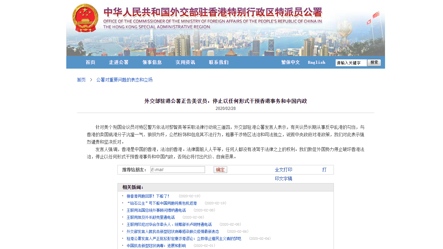 發言人強調,香港是中國的香港,法治的香港。法律面前人人平等,任何人都沒有淩駕於法律之上的權利。發言人敦促外國勢力停止破壞香港法治,停止以任何形式幹預香港事務和中國內政,否則必將付出代價、自食惡果。