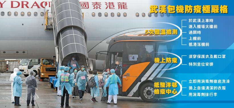 武漢機場現場所見,乘搭專機港人均戴上口罩,部分人還拖行李,現場亦有穿雨衣的小朋友。國泰港龍在起飛前為他們準備了食物,乘客進食時須分隔得遠一點,避免任何交叉感染機會。而上機前,乘客須穿上衛生署派發的藍色保護衣及口罩,並再一次探測體溫,確定沒有發燒才可上機。