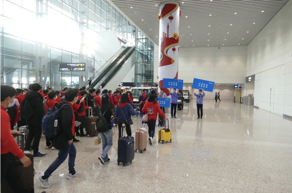 2月25日16時40分,一架搭載着300多人的企業復產復工包機抵達白雲機場。圖為包機上的企業員工在到達大廳集合。攝影:朱靜怡