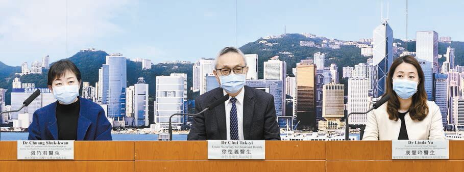 食衛局副局長徐德義(中)、衛防中心傳染病處主任張竹君(左)和醫管局總行政經理庾慧玲(右)昨就本港新冠肺炎最新疫情舉行簡報會。