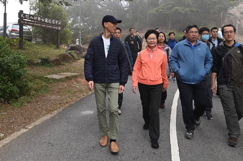 沿路上,梁肇輝向特首介紹近年漁護署在改善郊野公園上的工作,包括優化露營地點及設施、利用天然物料改善遠足徑、提供更多觀景台以供欣賞美景、加強遊客中心的服務等。其中大帽山郊野公園遊客中心新設的茶水亭,將於今年4月1日開始投入服務。