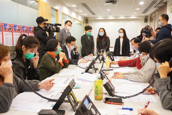 工聯會義務寄藥服務,日前已完成第四批次行動,累計協助1475 名港人寄出藥物。圖為特首林鄭月娥早前到訪義務寄藥行動現場情況。資料圖片