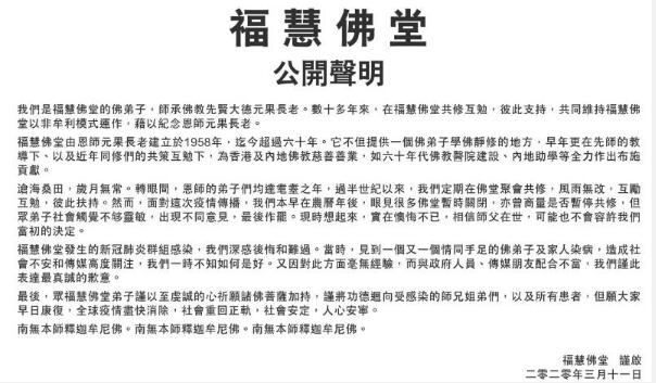 佛堂又指,当时见到一个又一个情同手足的弟子及其家人染病,造成社会不安和传媒高度关注,一時不知如何是好,并且对此方面毫無經驗,因此对與政府及傳媒配合不當表示歉意。