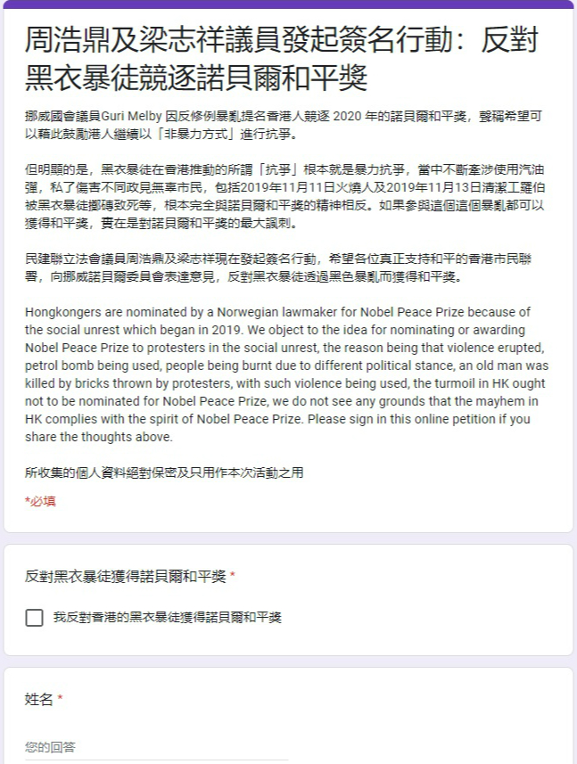 周浩鼎表示,現時與立法會議員梁志祥在網上發起簽名行動,希望真正支持和平的香港市民聯署,並向挪威諾貝爾委員會表達反對意見。