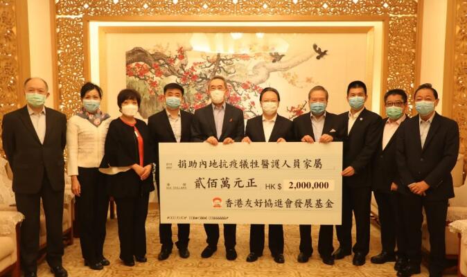 【香港商报网讯】3月11日上午,香港友好協進會、香港友好協進會發展基金向抗疫殉職醫護人員家屬捐款儀式在中聯辦舉行。唐英年會長,副會長胡定旭、霍震寰、譚錦球、陳清霞,發展基金主席團主席杜惠愷、朱李月華、蘇長榮等首長出席。中聯辦譚鐵牛副主任、協調部朱文部長代表接受。